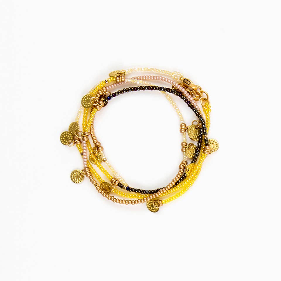 The sun disc wrap necklace & bracelet is handmade in a fair trade workshop in Guatemala.