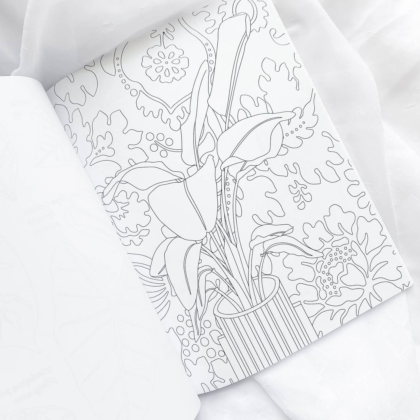 Drawings include potted plants, plant shelves, and encyclopedia style leaf identification pages. Wide variety of detail from simple to complex images for you to choose from. 50 single sided coloring pages (101 pages total) Just open, color, and relax!