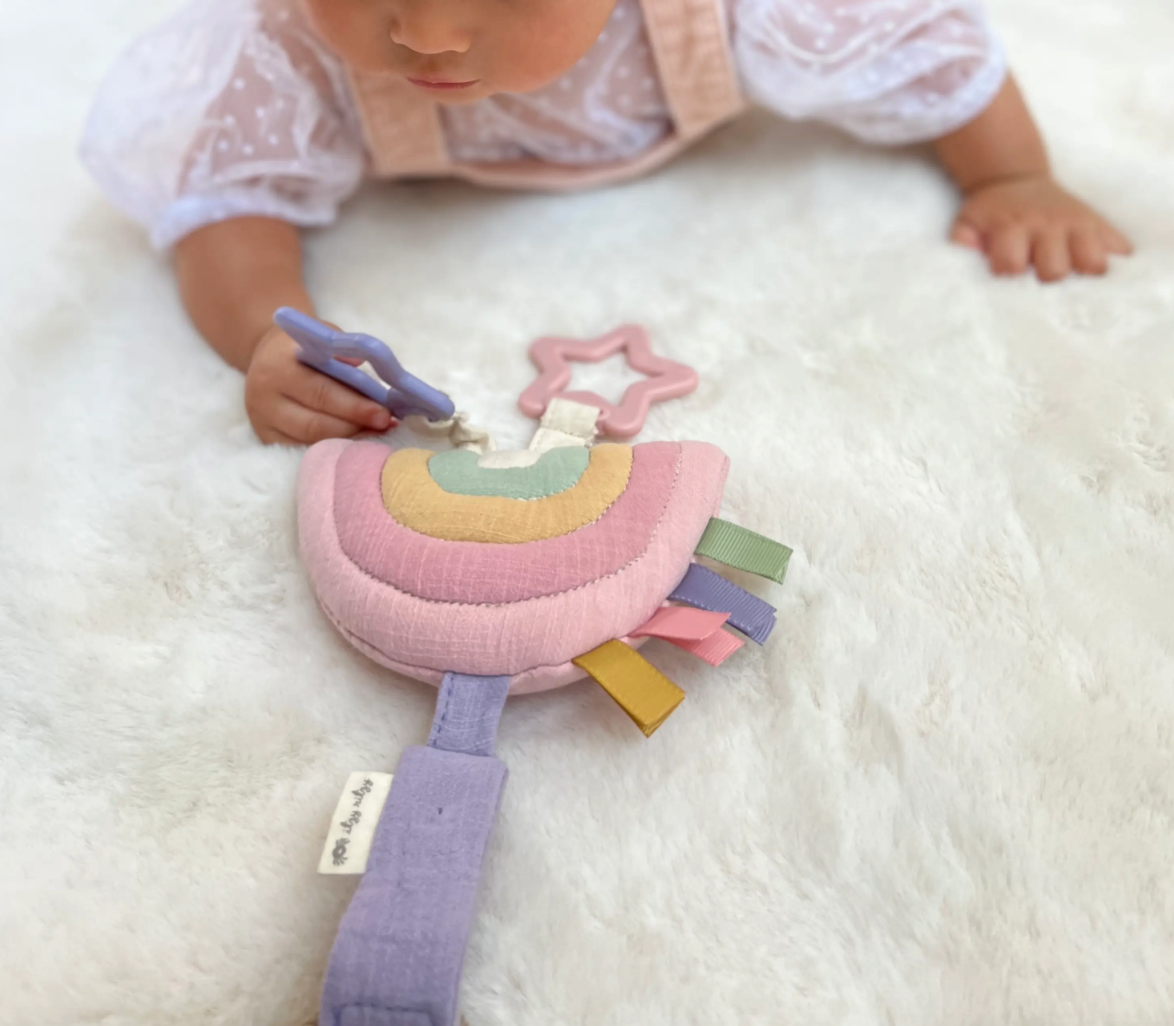 - Attaches easily to car seats, strollers and activity gyms with adjustable hook and loop straps