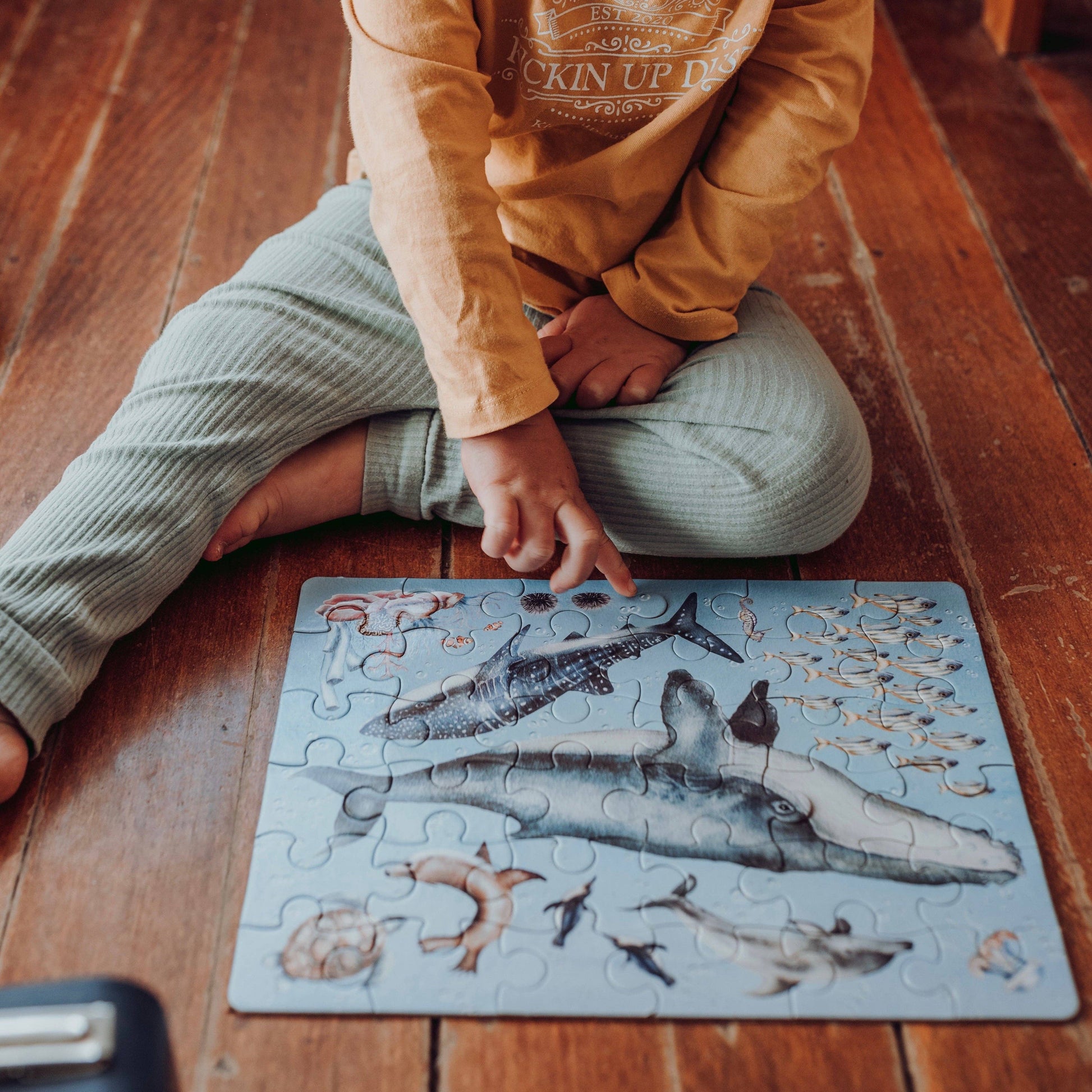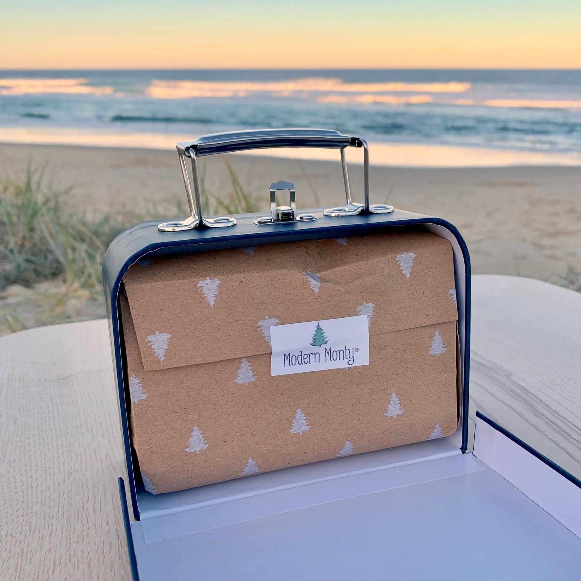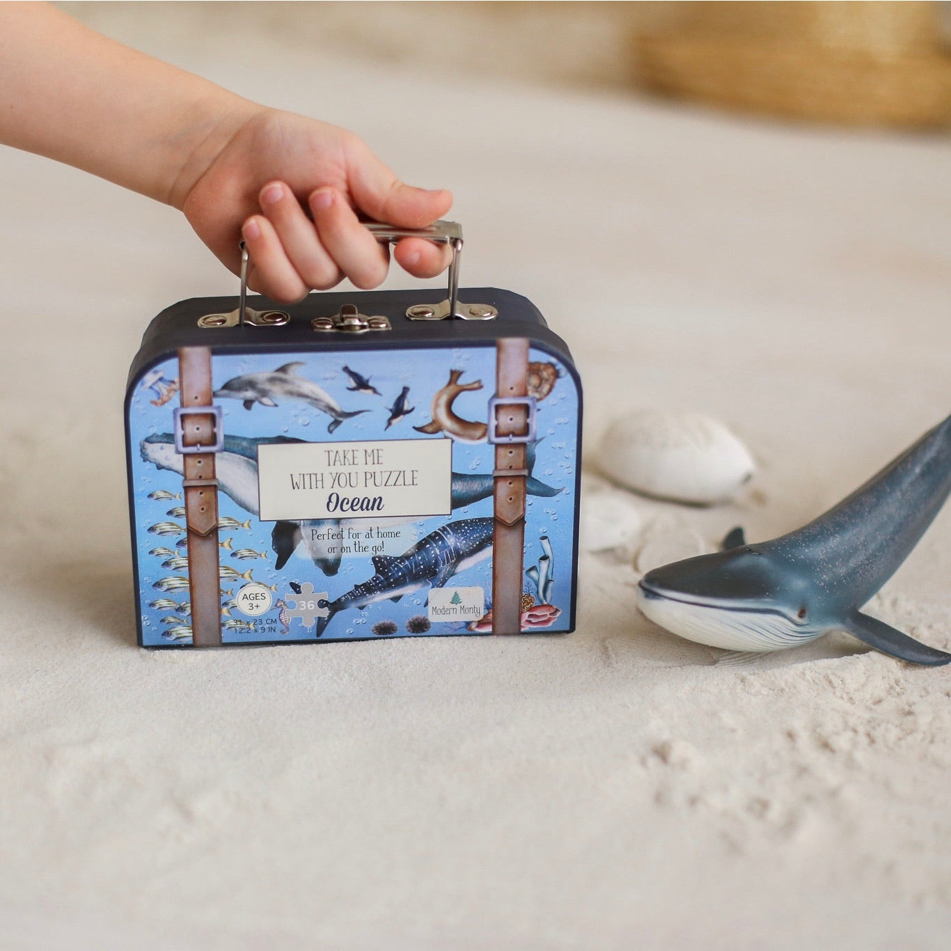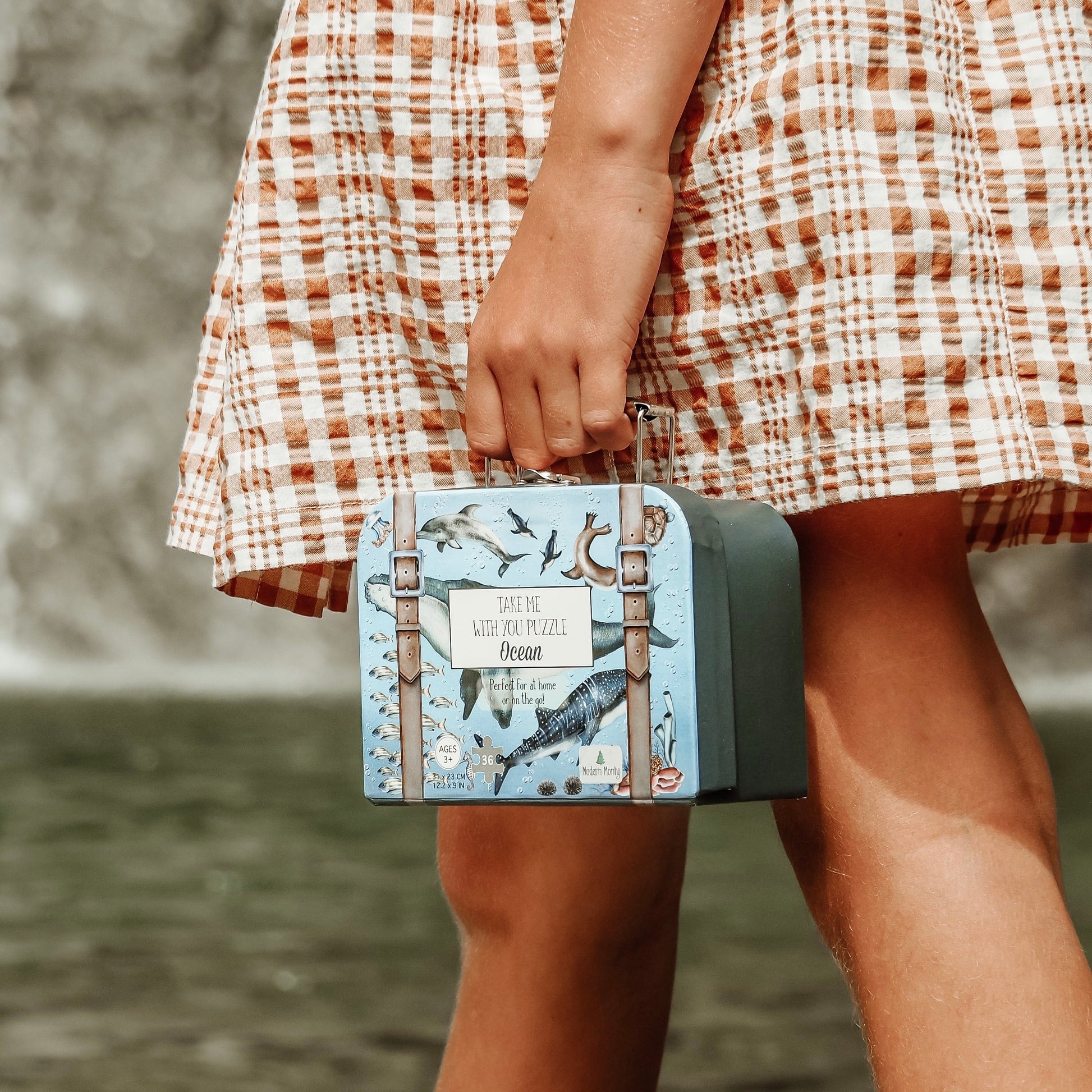 Our Ocean "Take Me With You" Puzzle is a stunning 36 piece jigsaw puzzle, packaged in the sweetest mini suitcase with a durable metal handle and latch. The puzzle pieces themselves are made of recycled materials and will be found inside a luxe paper bag to ensure this is another earth-friendly, ZERO plastic product.