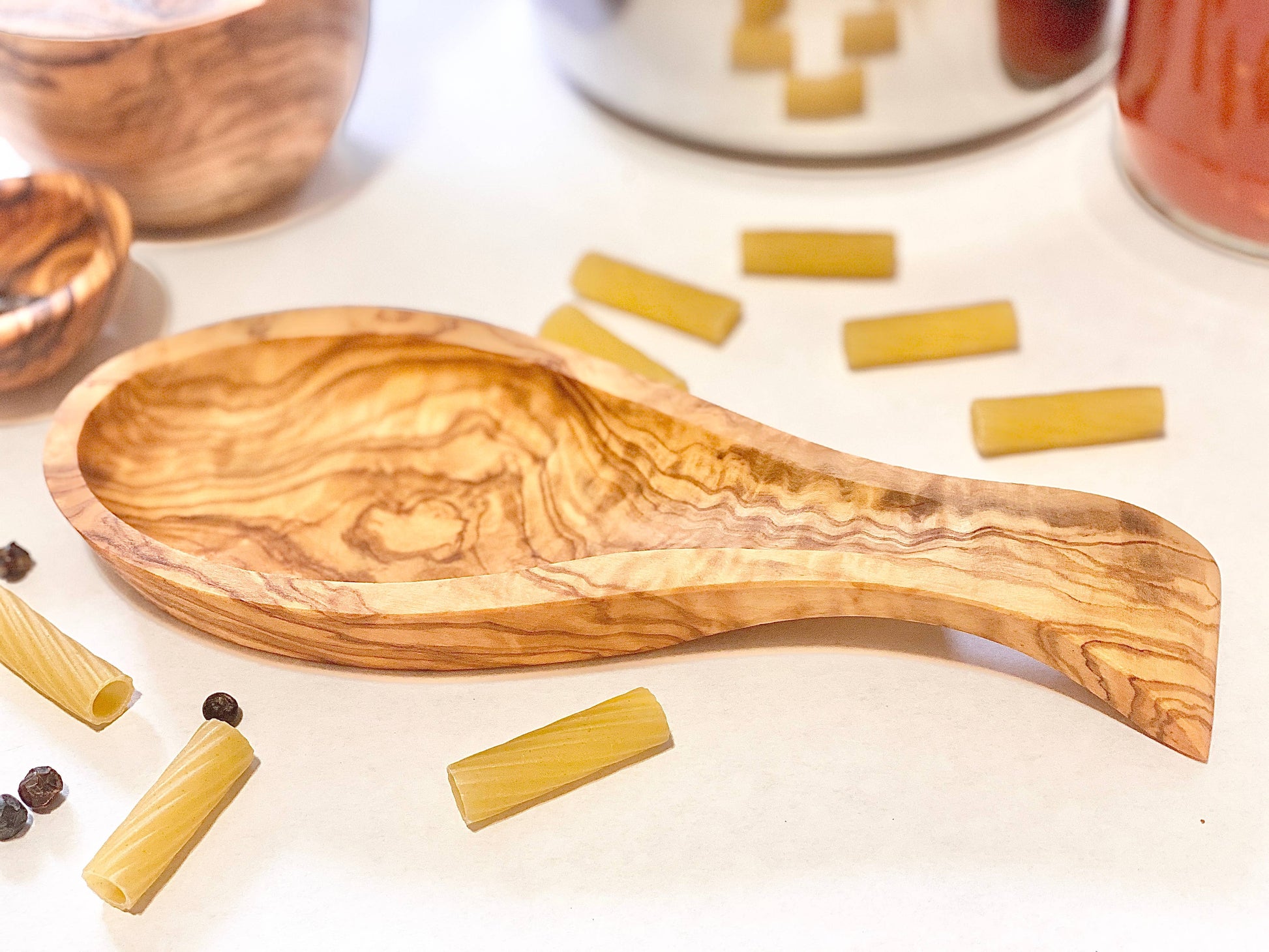 Perfect holder to contain spills and drips as you rest your spoon on your countertop. Olive wood is a hard wood making it very dense and durable for everyday use.