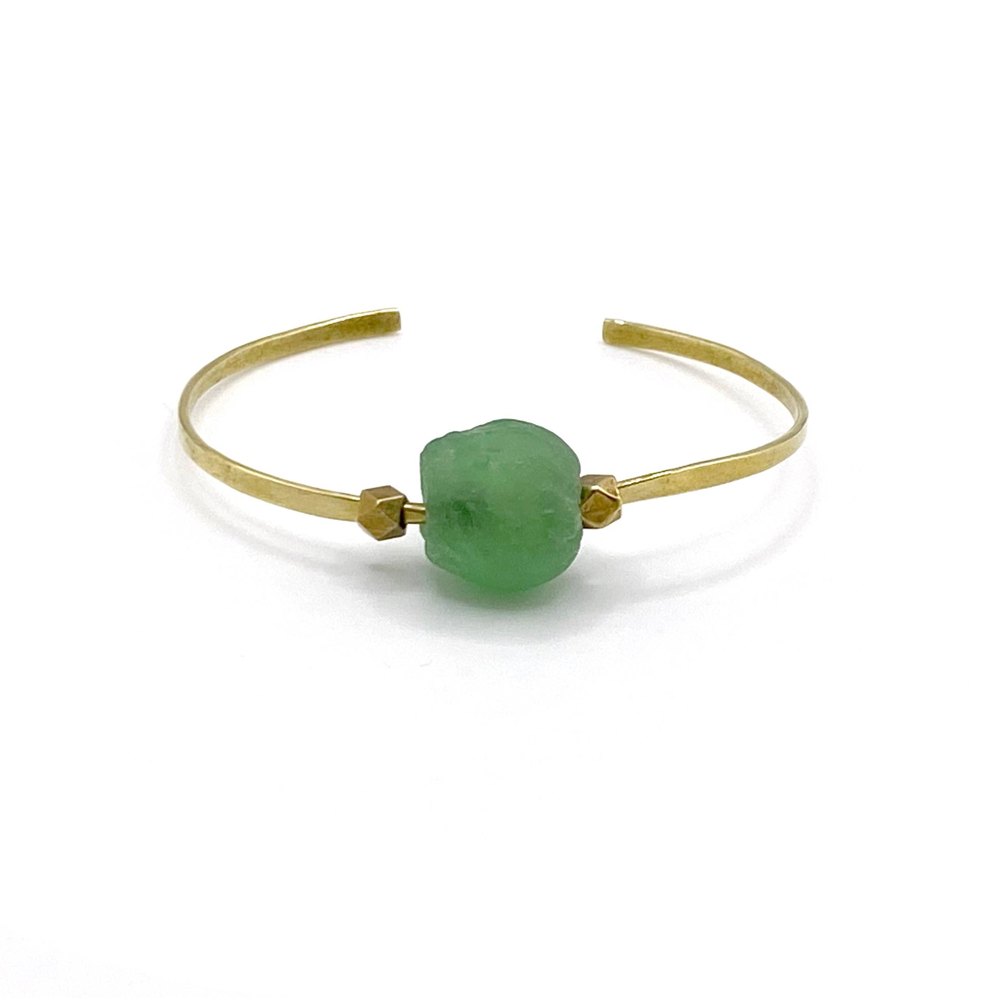 The Jasmine Cuff is made with a fused glass bead from Ghana and faceted brass beads. The cuff is open to fit most wrists and is a staff favorite. Part of our new Jasmine Collection, this cuff pairs with the entire collection and is sourced and handcrafted in Uganda.
